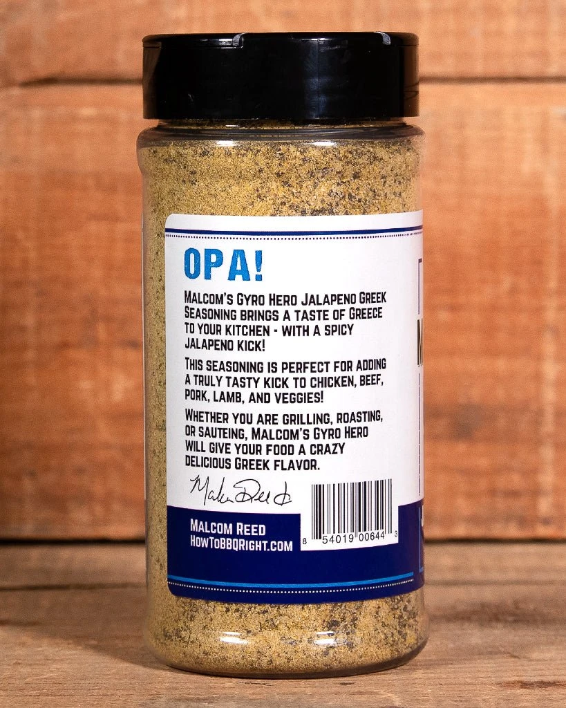 Malcom’s Gyro Hero Jalapeno Greek Seasoning brings a taste of Greece to your kitchen with a spicy jalapeno kick! This seasoning is perfect for adding a truly tasty kick to chicken, beef, pork, lamb, and veggies! Whether you are grilling, roasting, or sauteing, Malcom’s Gyro Hero will give your food a crazy delicious Greek flavor.