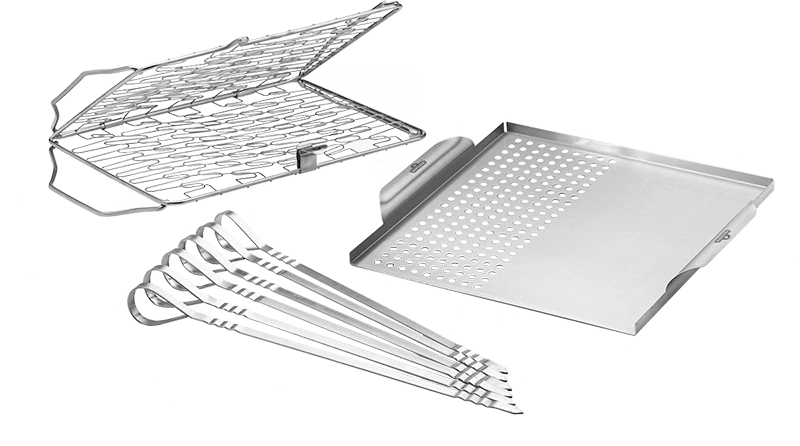 Making healthy choices when it comes to grilling a meal is even easier with the Napoleon Healthy Choice Starter Kit. The Stainless Steel Multifunctional Topper features two different sides, the perforated side is ideal for grilling veggies, while the flat side is perfect for searing delicate foods like fish and scallops, or cradling a wooden plank (not included) so you get that great smoky flavor without worry that the plank will burn. The reusable Stainless Steel skewers allow you to create custom kebabs with any vegetables or protein you wish. Raise delicate foods, like fish, off the cooking grids to prevent sticking, with the Flexible Grill Basket. Great for securely holding veggies, seafood, and it’s superb at making grilled sandwiches. All parts are easy to clean; just toss them into the dishwasher. Make it easier to make healthy meals with Napoleon’s Healthy Choice Starter Kit.