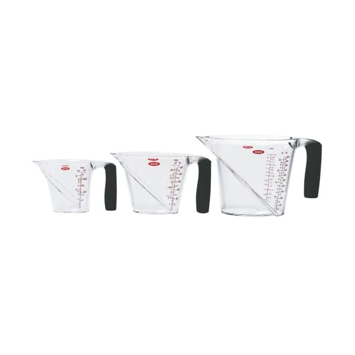 The patented angled surface allows you to see measurement markings from above as you’re pouring, so you can better measure ingredients without bending or lifting the cup to eye level. Contains markings for cups, ounces, and milliliters. Includes 1-Cup, 2-Cup and 4-Cup Angled Measuring Cups.