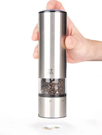 The Elis Sense duo of electric mills is made for lovers of technology and beautiful objects. A classy design composed of stainless steel and acrylic. A genuine innovation, simply touch the body and head of the mill at the same time to activate it. The mill then supplies exactly the right dose of salt or pepper. A light illuminates during use. Equipped with the Peugeot mechanism, ultra-resistant with proven performance, it guarantees perfect longevity. The u’Select patented grind control system allows for precise adjustment of coarseness as required. Six dimensions of pepper or salt are available. The salt and pepper mills that form this duo are accompanied by a container of black pepper and dry salt crystals and a duo base. With Peugeot, innovation is always in the service of the useful and enjoyable!
